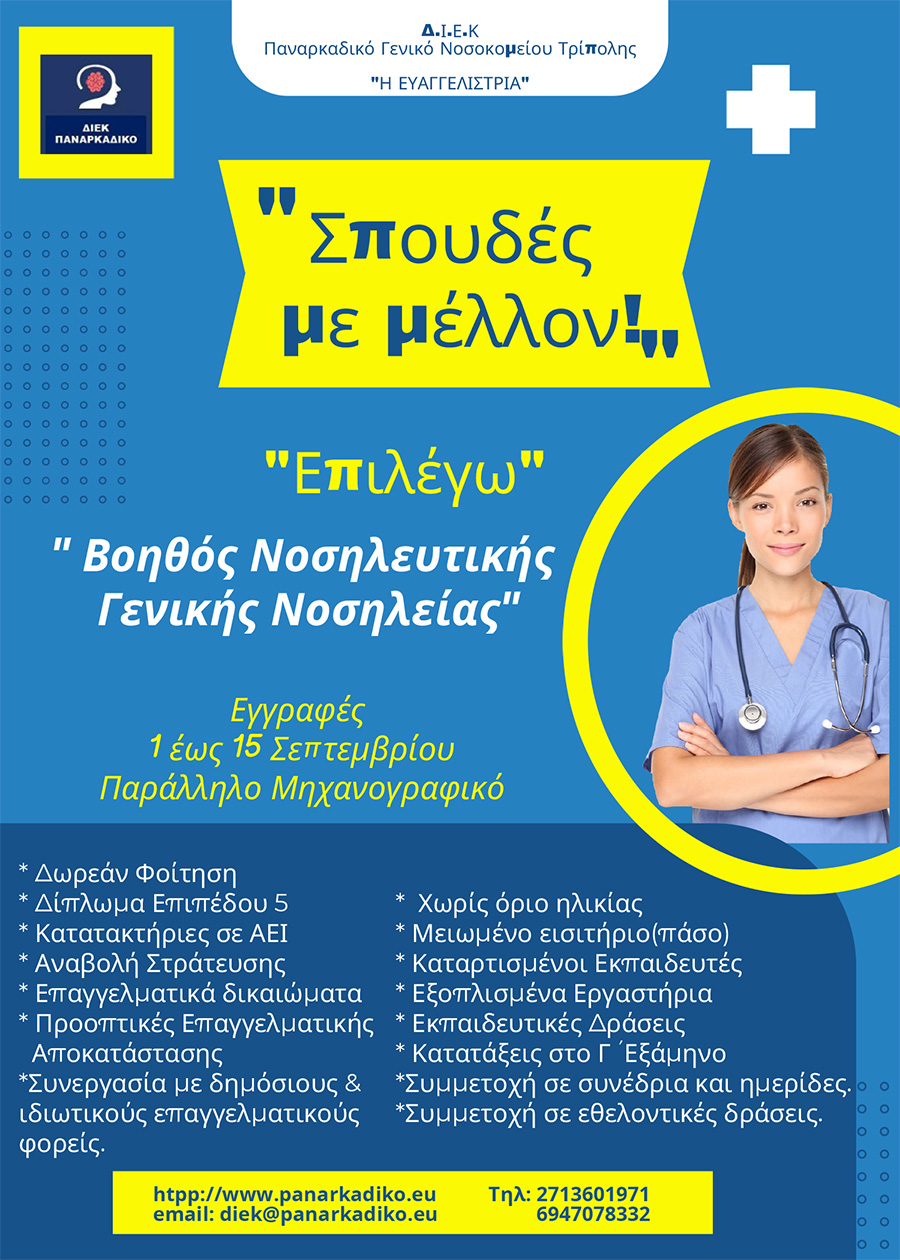 Το ΔΙΕΚ Γ.Π.Ν. Τρίπολης αποτελεί μια μοναδική ευκαιρία για οποιονδήποτε επιθυμεί να έχει μια εργασία με σίγουρη μελλοντική αποκατάσταση, λαμβάνοντας παράλληλα καθώς και όλα τα εφόδια για να γίνει ένας σωστός επαγγελματίας υγείας.