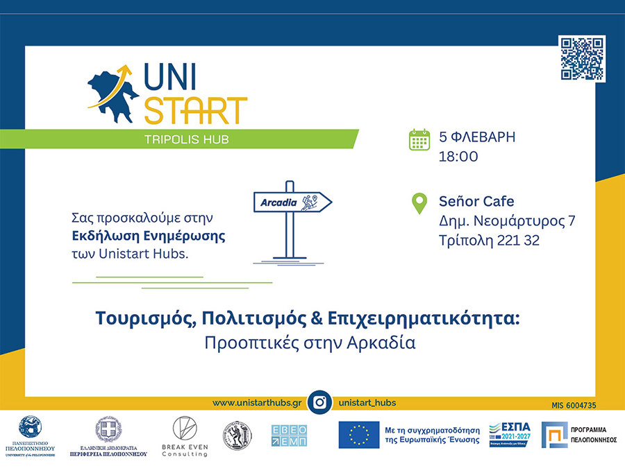Η Εκδήλωση Ενημέρωσης των Unistart Hubs θα διεξαχθεί παρουσία του περιφερειάρχη Πελοποννήσου, Δημήτρη Πτωχού, καθώς και αντιπεριφερειαρχών, αναδεικνύοντας τις προοπτικές ανάπτυξης της περιοχής μέσα από καινοτόμες δράσεις και συνέργειες.