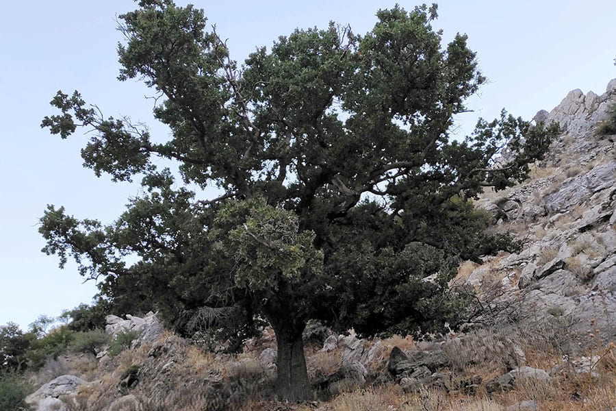 Η μνημειακή βελανιδιά φύεται στο βραχώδες έδαφος του Πολυαράβου σε υψόμετρο 844 m και έχει περίμετρο βάσης κορμού 5 m, ενώ ο εξαιρετικά τραχύς φλοιός του κορμού της με τις βαθιές αυλακώσεις και τις εκτεθειμένες ρίζες, που λειτουργούν ως «άγκυρες στήριξης» στον βράχο, αποτελούν αδιάψευστα τεκμήρια προσαρμογής στο σκληρό μανιάτικο τοπίο. Ο Πολυάραβος αποτελεί τον υψηλότερο οικισμό της Μάνης, που δεσπόζει σαν φυσική ακρόπολη στους πρόποδες του όρους Ζίζιαλη σε υψόμετρο 880 m. Χτισμένος πάνω σε βραχώδες αντέρεισμα του Ταϋγέτου, διατηρεί την αυθεντικότητά του ως χαρακτηρισμένος Παραδοσιακός Οικισμός (ΦΕΚ 594/Δ/13-11-1978) με μοναδική αρχιτεκτονική ταυτότητα που μαρτυρεί την ιδιαίτερη αμυντική σημασία του κατά την Επανάσταση του 1821.