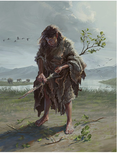 2. Kαλλιτεχνική απεικόνιση γυναίκας του μέσου Πλειστόκαινου ενώ σκαλίζει κλαρί δένδρου. Credit: Katerina Harvati