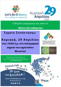 O Φορέας Διαχείρισης Πάρνωνα, Μουστού, Μαινάλου και Μονεμβασίας συμμετέχει για έβδομη συνεχόμενη χρονιά στην παγκόσμια εθελοντική καμπάνια «Let’s Do It Greece» που θα πραγματοποιηθεί πανελλαδικά την Κυριακή 29 Απριλίου 2018 υπό τον συντονισμό της Ελληνικής Εταιρείας Διαχείρισης Στερεών Αποβλήτων (ΕΕΔΣΑ) και του Περιβαλλοντικού Συλλόγου Αττικής «Ώρα για Δράση».