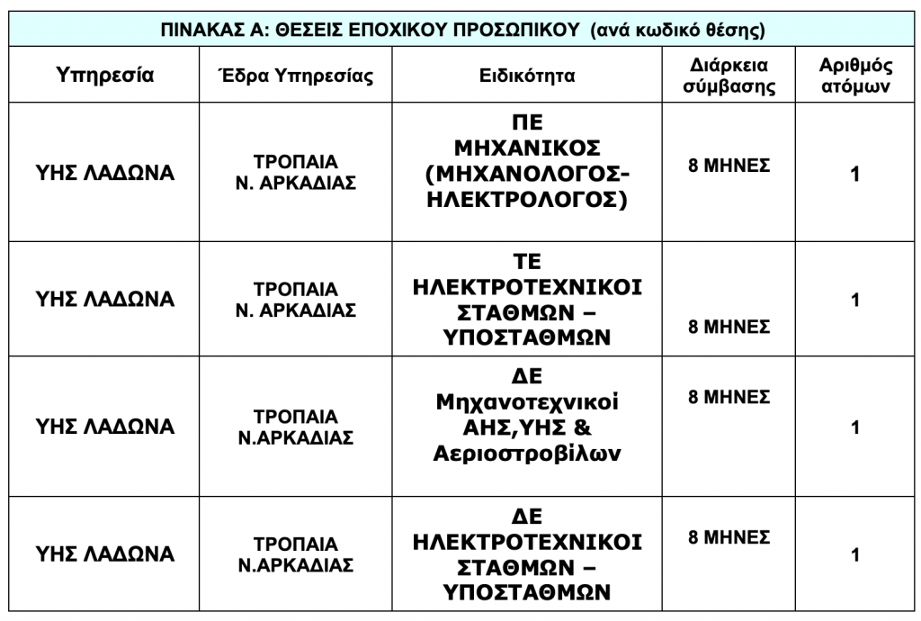 Η ΔΕΗ Α.Ε. Ανακοινώνει την πρόσληψη συνολικού αριθμού τεσσάρων (4) ατόμων για κάλυψη εποχικών ή παροδικών αναγκών με σύμβαση εργασίας ιδιωτικού δικαίου ορισμένου χρόνου, έως 8 μήνες βάση του άρθρου 4 του Ν.4643/19, όπως ισχύει.