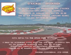 Με μεγάλη μας χαρά σας προσκαλούμε στα εγκαίνια της πίστας καρτ Speed Park Tripolis, το Σάββατο 25 Ιουνίου 2022 και ώρα 20:00, στο 4ο χλμ Τρίπολης – Σπάρτης (περιοχή Τζίβα), στην Τρίπολη.