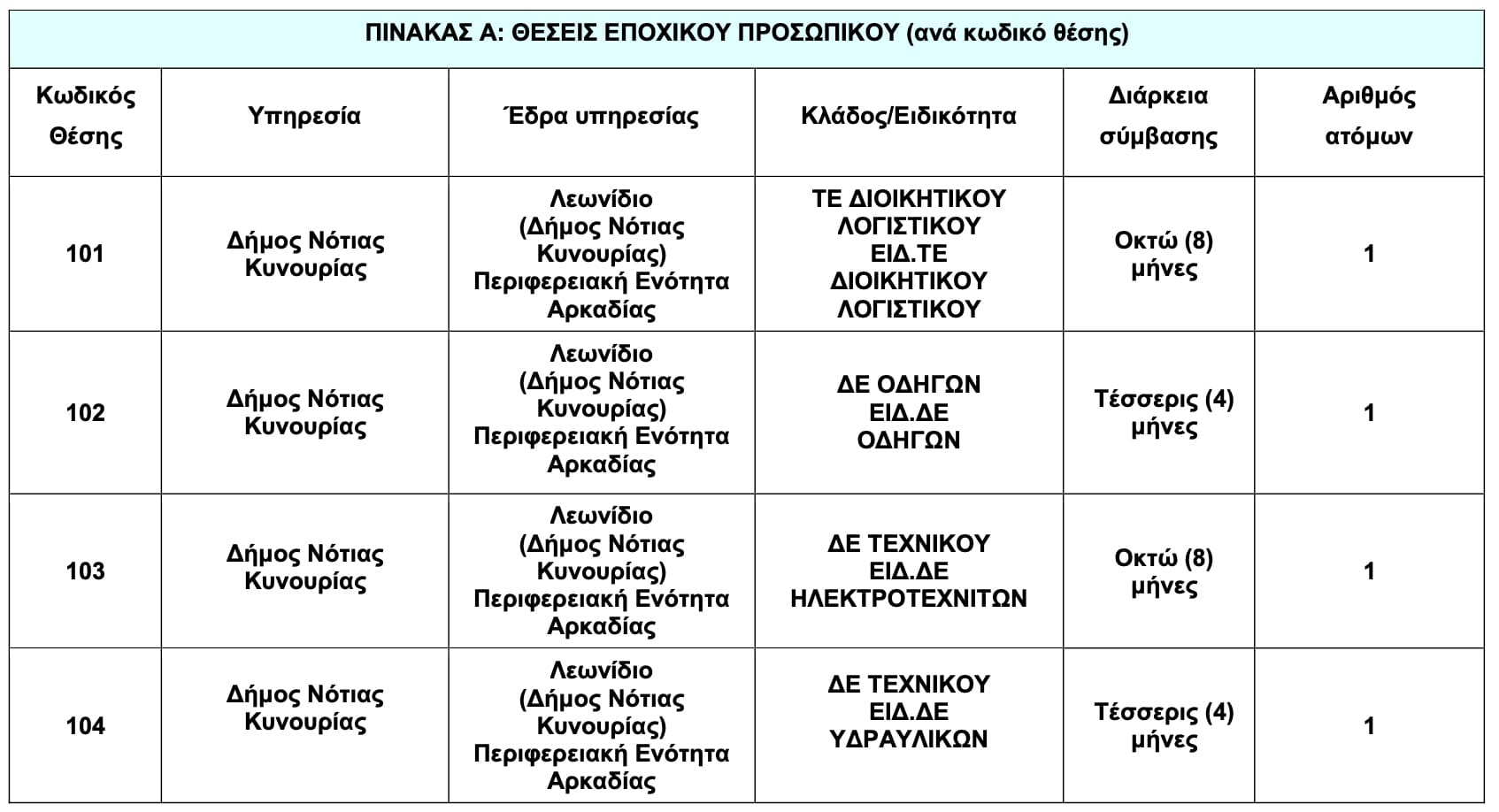 Ο Δήμος Νότιας Κυνουρίας ανακοινώνει την πρόσληψη, με σύμβαση εργασίας ιδιωτικού δικαίου ορισμένου χρόνου, συνολικά τεσσάρων (4) ατόμων για την κάλυψη αναγκών στο Δήμο Νότιας Κυνουρίας, που εδρεύει στο Λεωνίδιο της Περιφερειακής Ενότητας Αρκαδίας και συγκεκριμένα του εξής, ανά υπηρεσία, έδρα, ειδικότητα και διάρκεια σύμβασης, αριθμού ατόμων (βλ. ΠΙΝΑΚΑ Α), με τα αντίστοιχα απαιτούμενα (τυπικά και τυχόν πρόσθετα) προσόντα.
